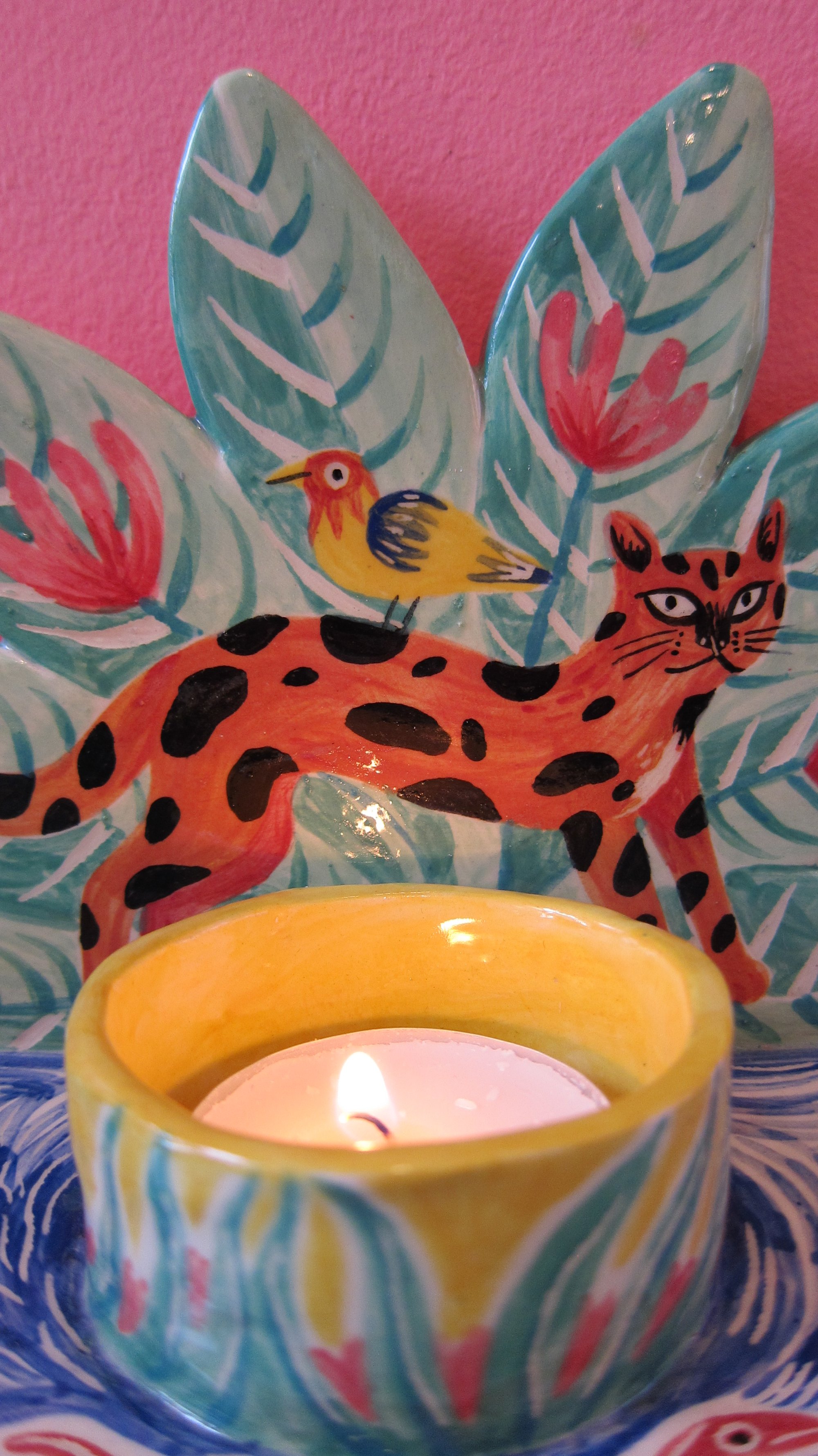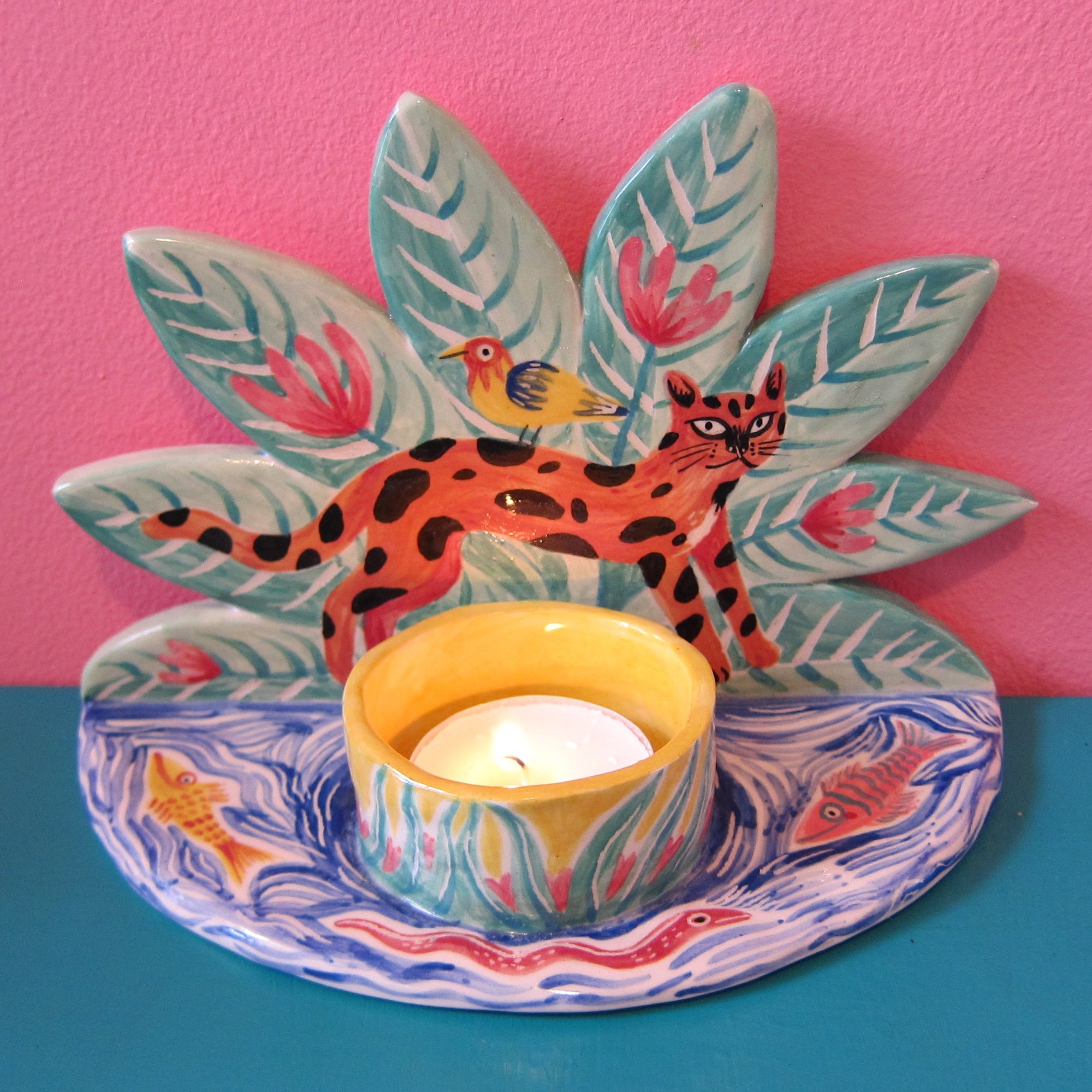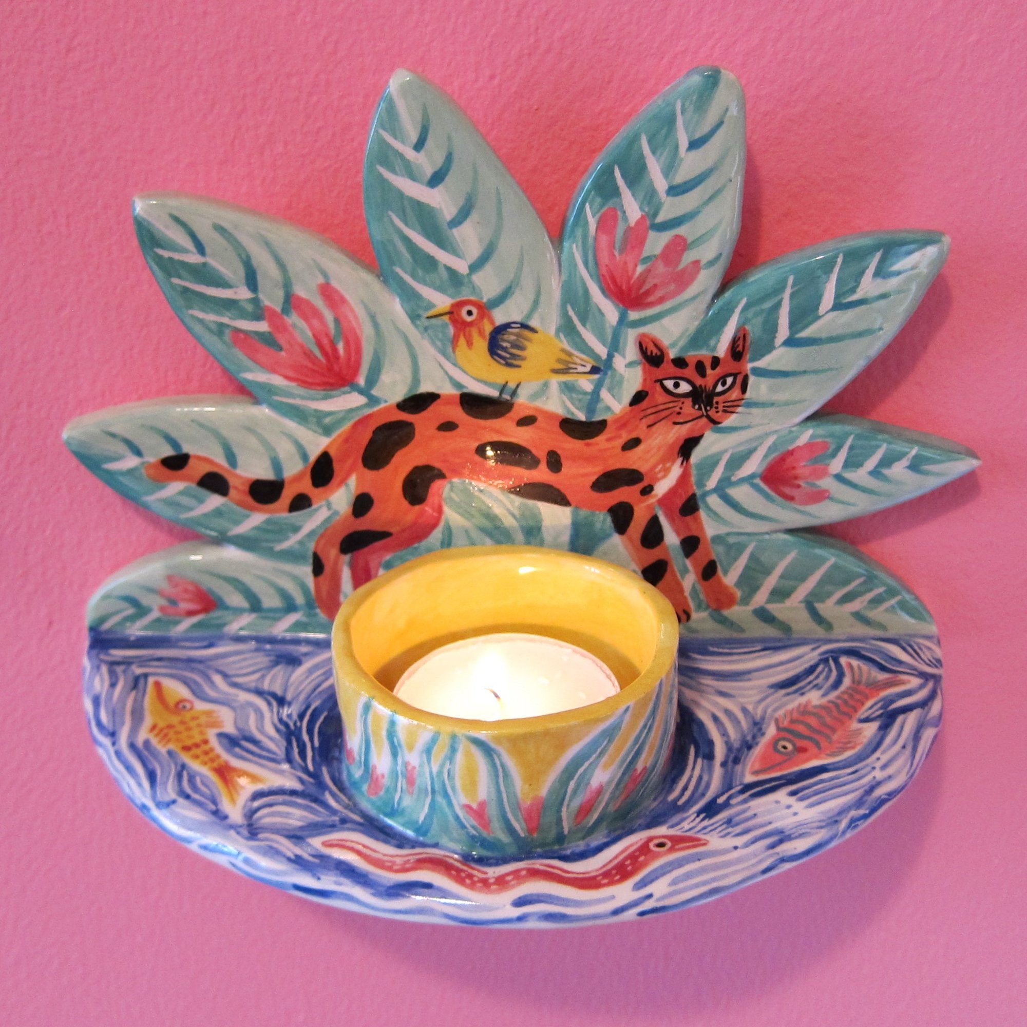 This tealight sconce in glazed earthenware is one of a kind, and can be hung on the wall or displayed on a shelf. Dimensions: approximately 16.5cm width by 11.5cm height and 8cm depth. Fits a standard tealight.